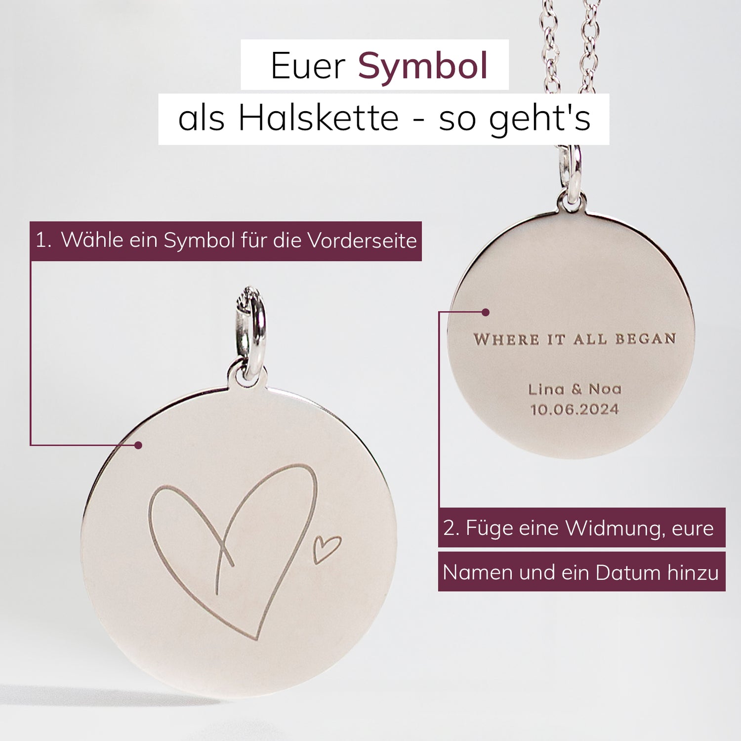 Personalisierte Halskette - wähle ein Symbol, füge eine Widmung, eure Namen und Datum hinzu. Das perfekte Geschenk zum Jahrestag.